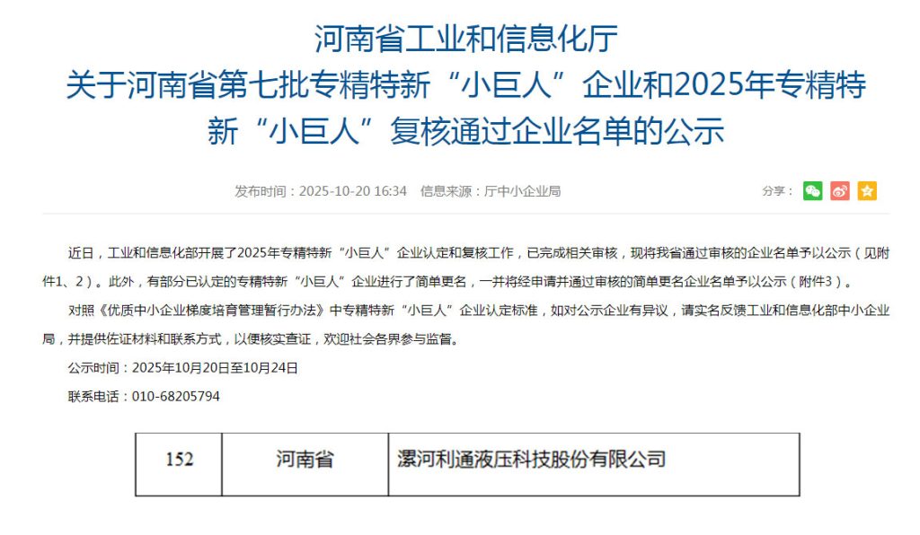 近日,國家工業和信息化部圓滿完成2025年專精特新“小巨人”企業認定和復核工作,并由河南省工信廳對省內通過企業名單進行了公示。利通科技憑借在技術創新、產品品質、市場應用、品牌建設、產業鏈配套及精細化管理等領域的綜合實力,成功通過專精特新“小巨人”企業復審,再次彰顯超高壓流體技術領域標桿地位。